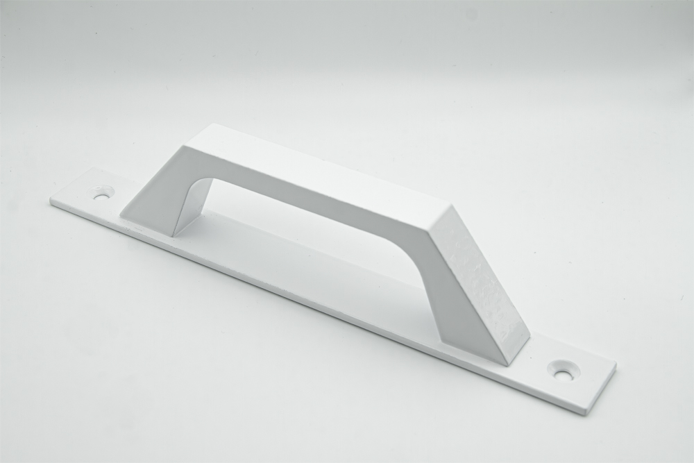Manija estilo asa para ventana corredera, elaborada en aluminio lacado blanco con base rectangular y orificios de fijación.