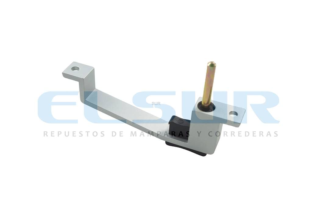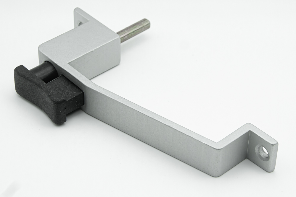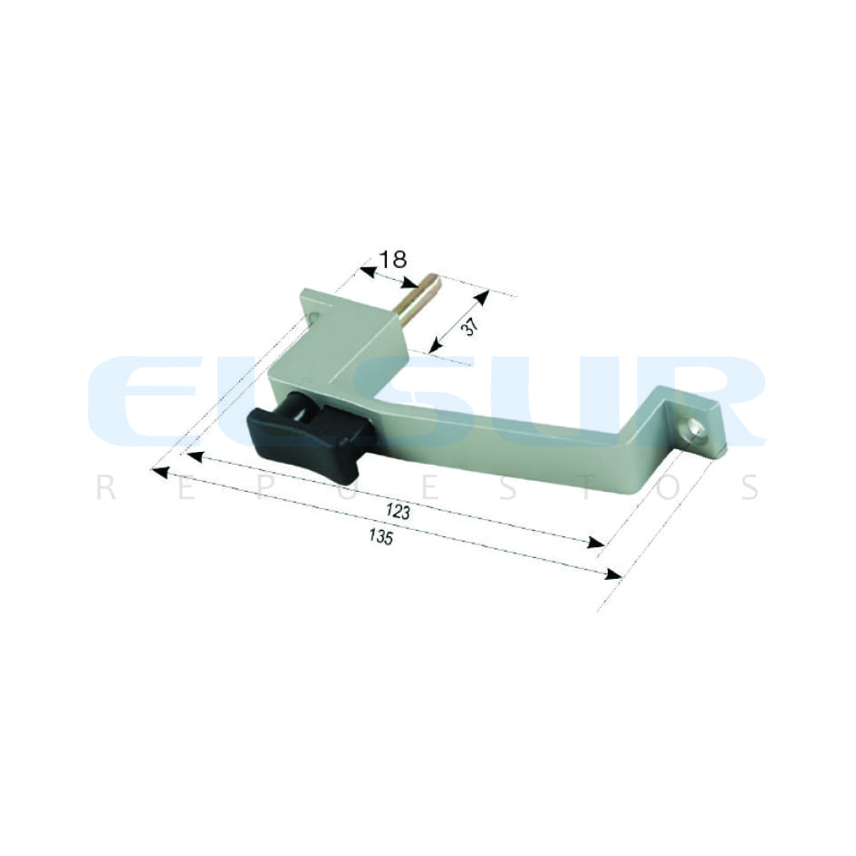 Asa de superficie de aluminio lacado en color plata y nylon con pulsador para apertura y cierre de puertas y ventanas correderas. Se fija al perfil de aluminio mediante tornillos o remaches. Funciona bloqueando y desbloqueando el deslizamiento con un solo pulsador.