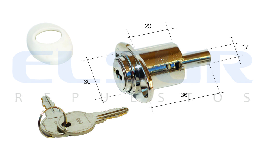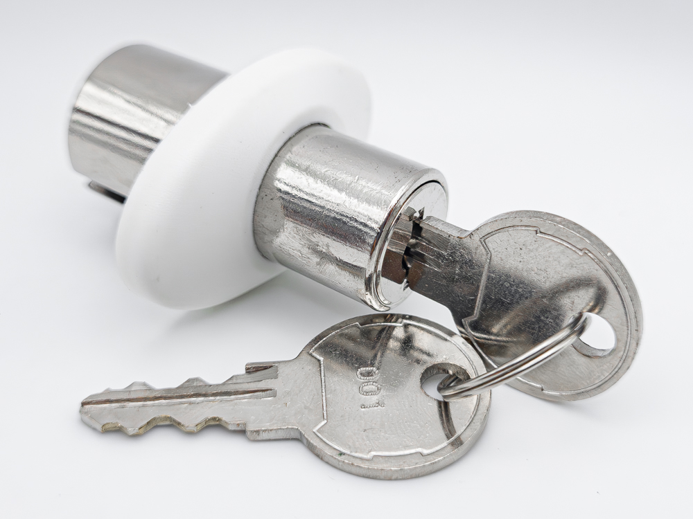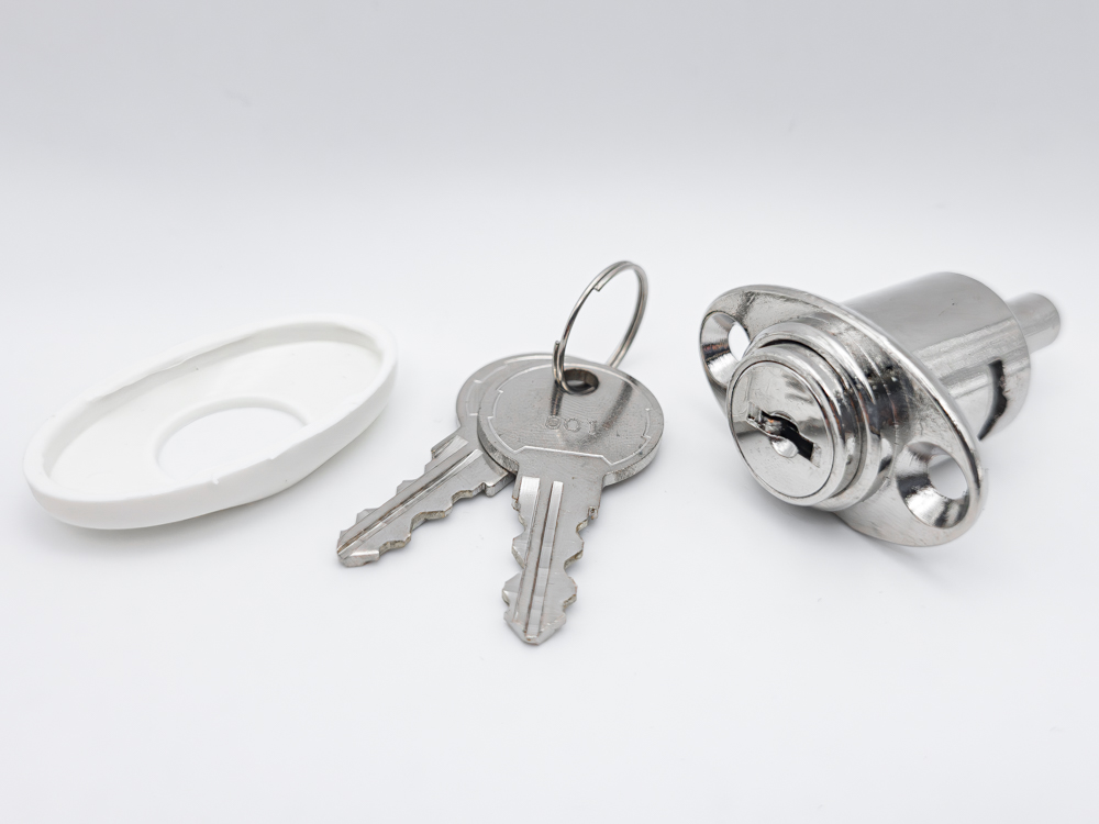 Cierre de seguridad para puertas y ventanas correderas con desbloqueo del pulsador provisto de cerradura y llaves. El botón pulsado impide el deslizamiento de las hojas correderas. La cerradura se fija al perfil mediante tornillos de rosca chapa o remaches que se esconden bajo el embellecedor de plástico blanco.