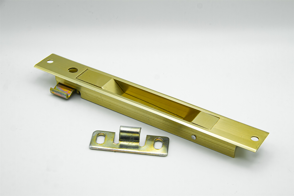Cierre embutido de accionamiento frontal para puertas y ventanas correderas de aluminio antiguas. Fabricado en aluminio lacado en color oro, modelo estrecho. Se fija al perfil de aluminio con dos tornillos de rosca chapa.