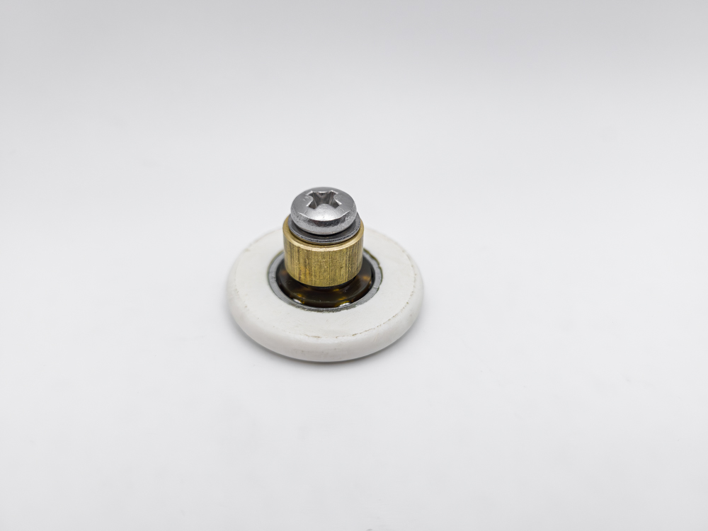 Tan sólo hace falta extraer la puerta de la mampara liberando el rodamiento del perfil, aflojar el tornillo que lo sujeta al marco de aluminio y reemplazar el rodamiento deteriorado por uno nuevo.