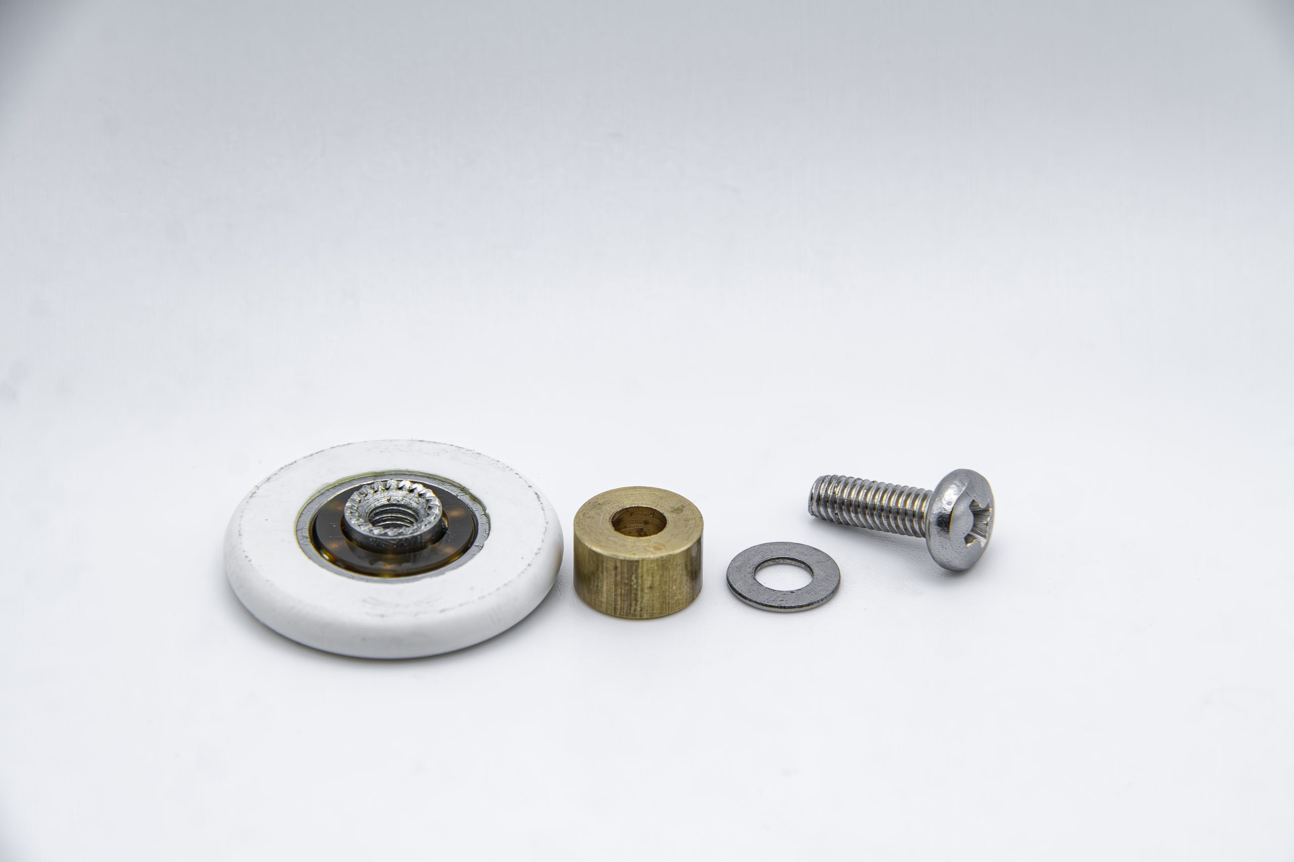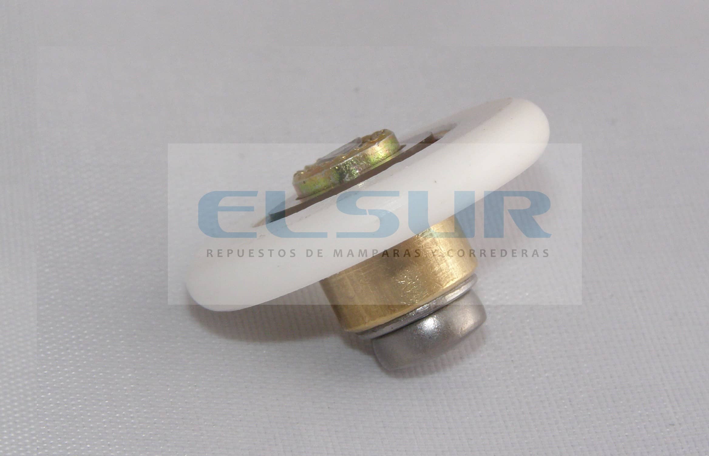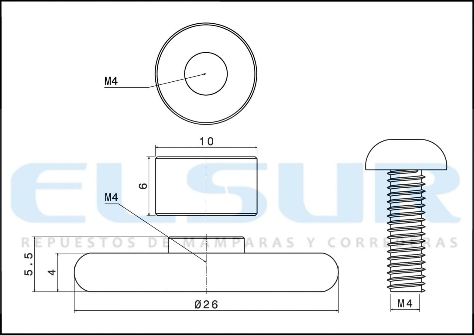 - Rodamiento de bolas para mampara corredera frontal, de 26 mm de diámetro y 4 mm de grosor, con eje roscado de M4 y prolongador del cuello de la rueda de 6 mm.