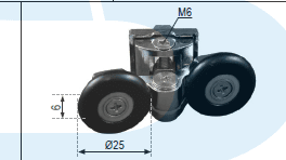 Rodamiento doble articulado con soporte cromado para mampara de ducha. Tornillo M6, diámetro rueda 25 mm. RAN (2 unidades)