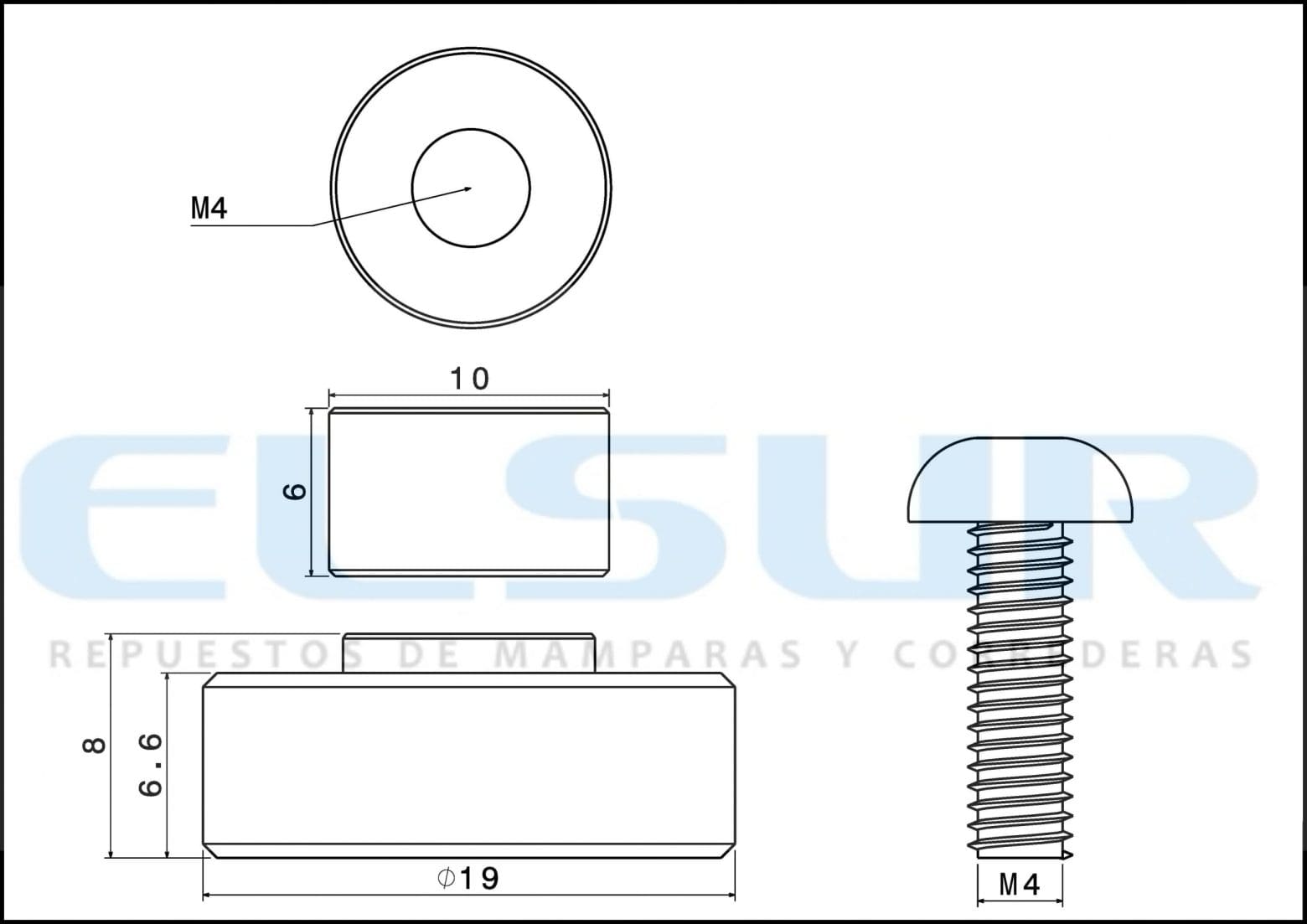 Pista lisa 19mm casquillo 6mm arandela y tornillo métrica 4×12 inox (4 UNIDADES)