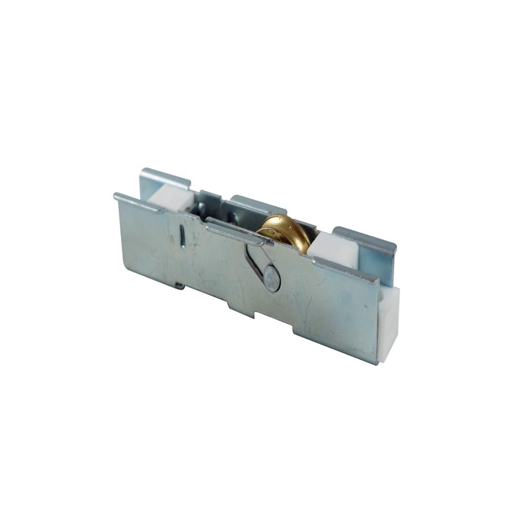 Rodamiento de bolas de altura regulable montado en carcasa de acero para perfiles de PVC de canal 16 europeo. Rueda metálica de 20 mm de diámetro por 7 mm de ancho. Ajustable moviendo el tornillo de regulación. Ideal para puertas y ventanas correderas.