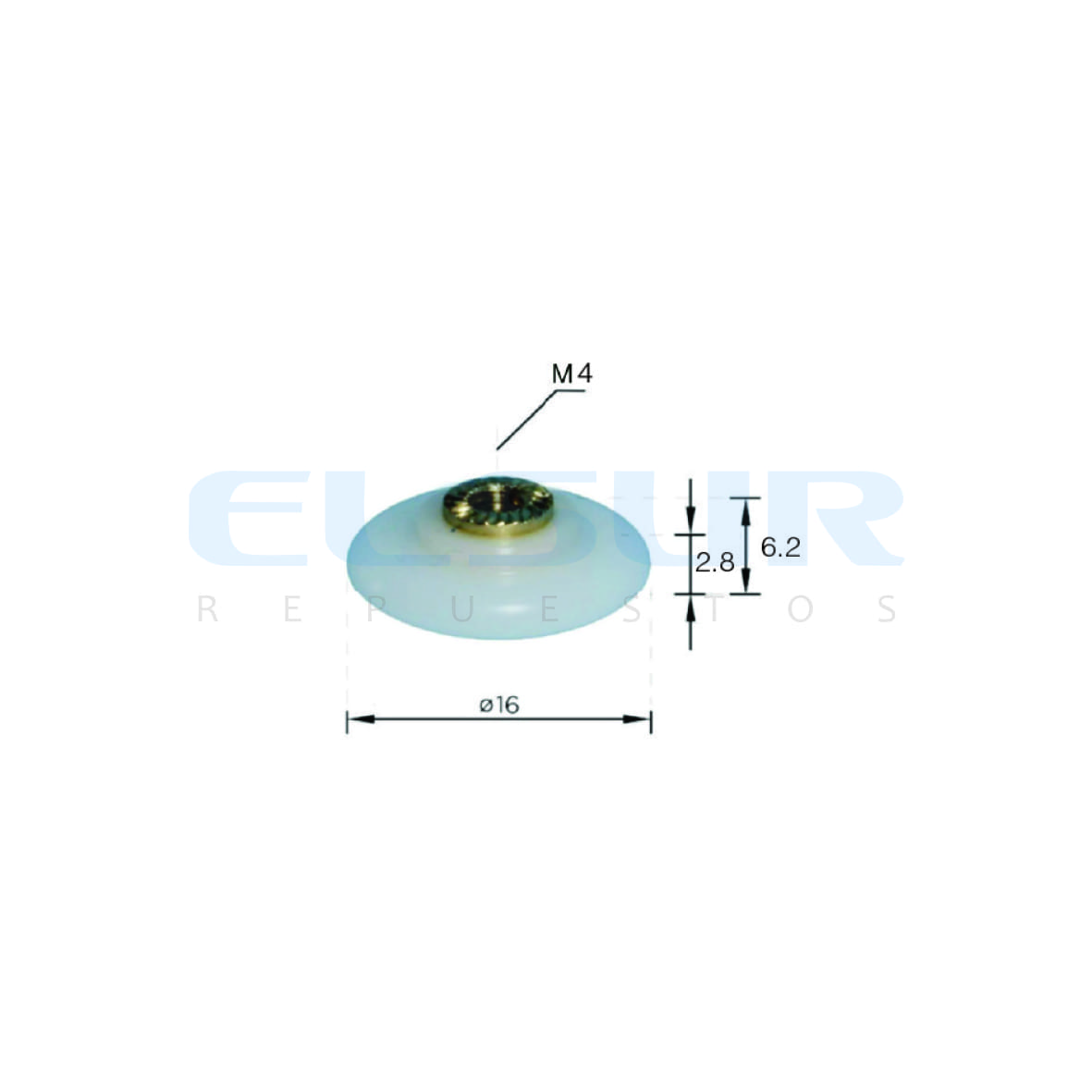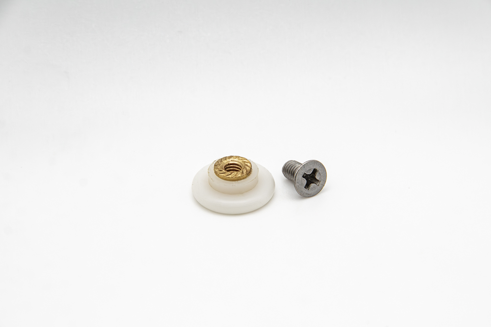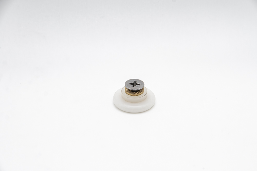 • Rodamiento de mampara estándar de 16 milímetros de diámetro, fabricado en nylon blanco y latón, con eje de casquillo roscado de M4.