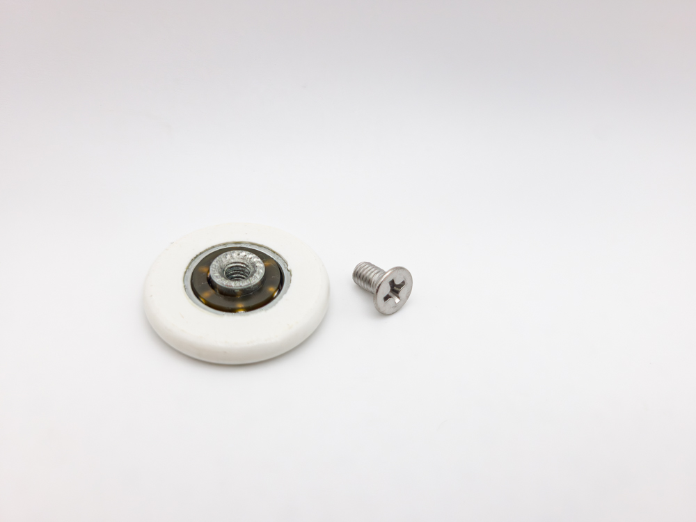 Tan sólo hace falta extraer la puerta de la mampara liberando el rodamiento del perfil, aflojar el tornillo que lo sujeta al marco de aluminio y reemplazar el rodamiento deteriorado por uno nuevo.