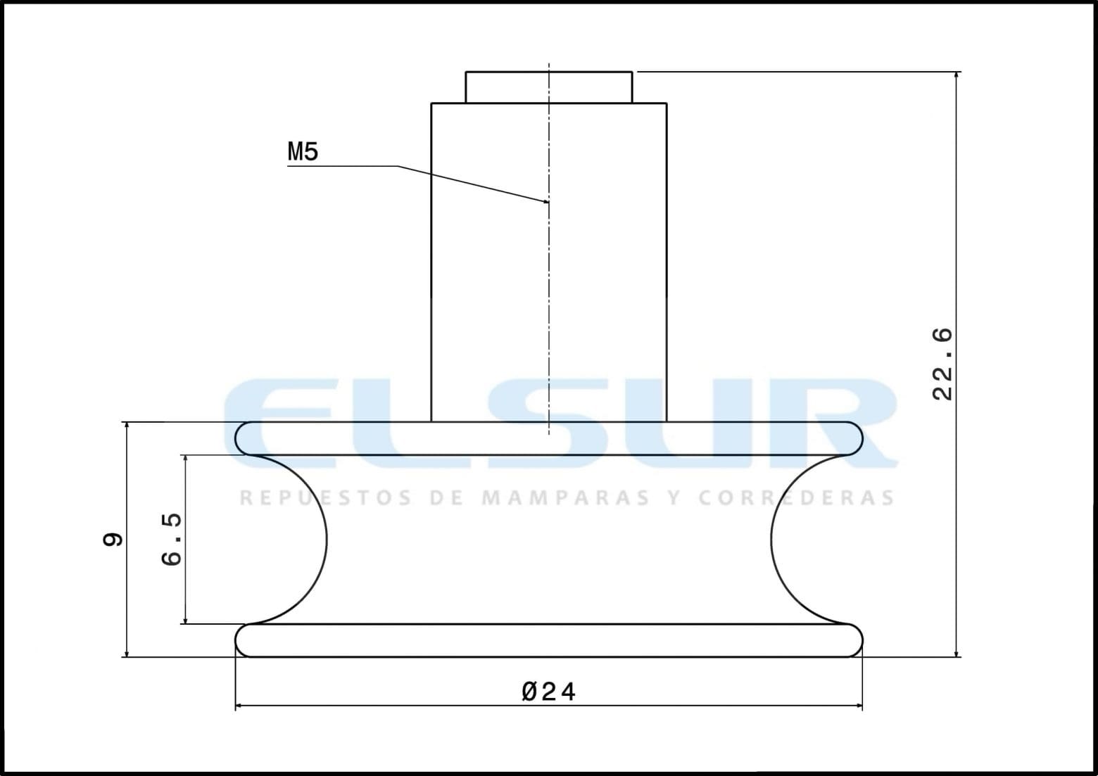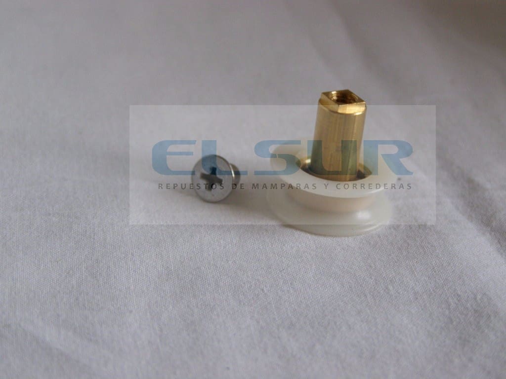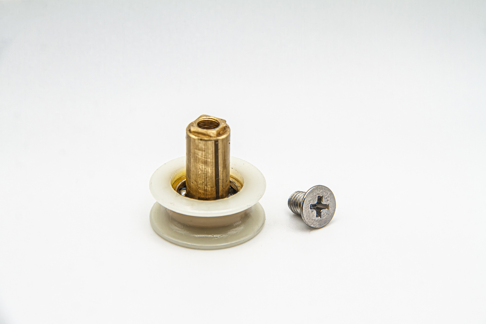 - Rodamiento de bolas fabricado en nylon para mampara de ducha de tipo polea de 24 mm de diámetro, provisto de cuello roscado de latón, M5.