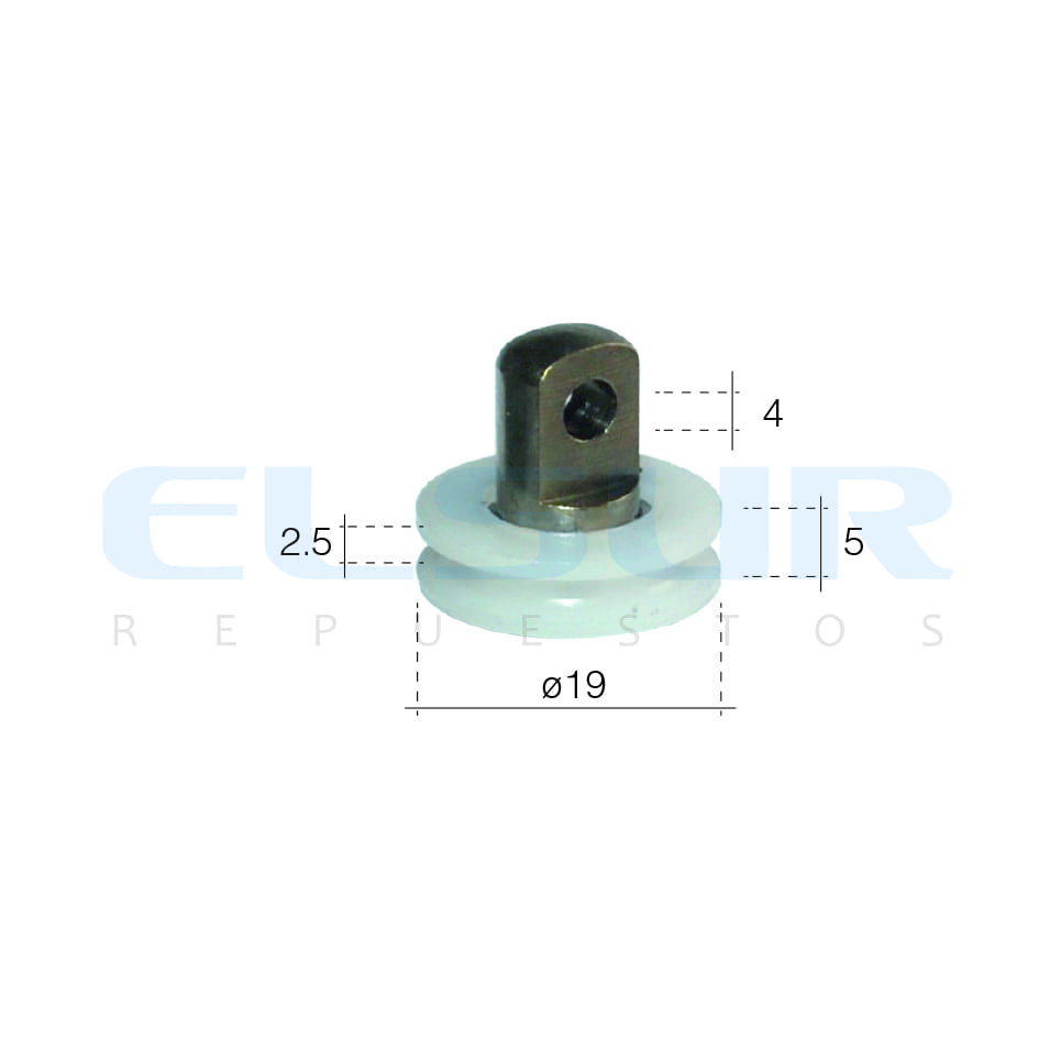 - Con un diámetro de 19 mm y un grosor de 5 mm, este rodillo cuenta con una cogida lateral con paso de rosca de 4 mm.