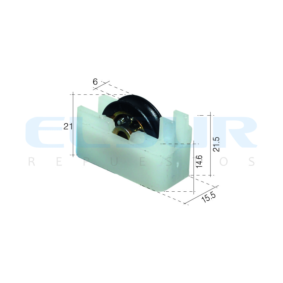 Rodamiento de bolas para puertas y ventanas correderas, diseñado con una carcasa de nylon blanco y compatible con perfiles de aluminio de la serie CLL. Con una rueda de 20 mm de diámetro y 6 mm de ancho, ofrece un funcionamiento suave y duradero. Ideal para sistemas de corredera de alta calidad.