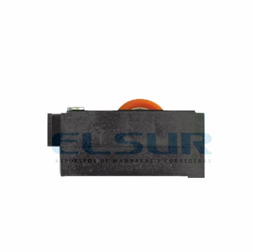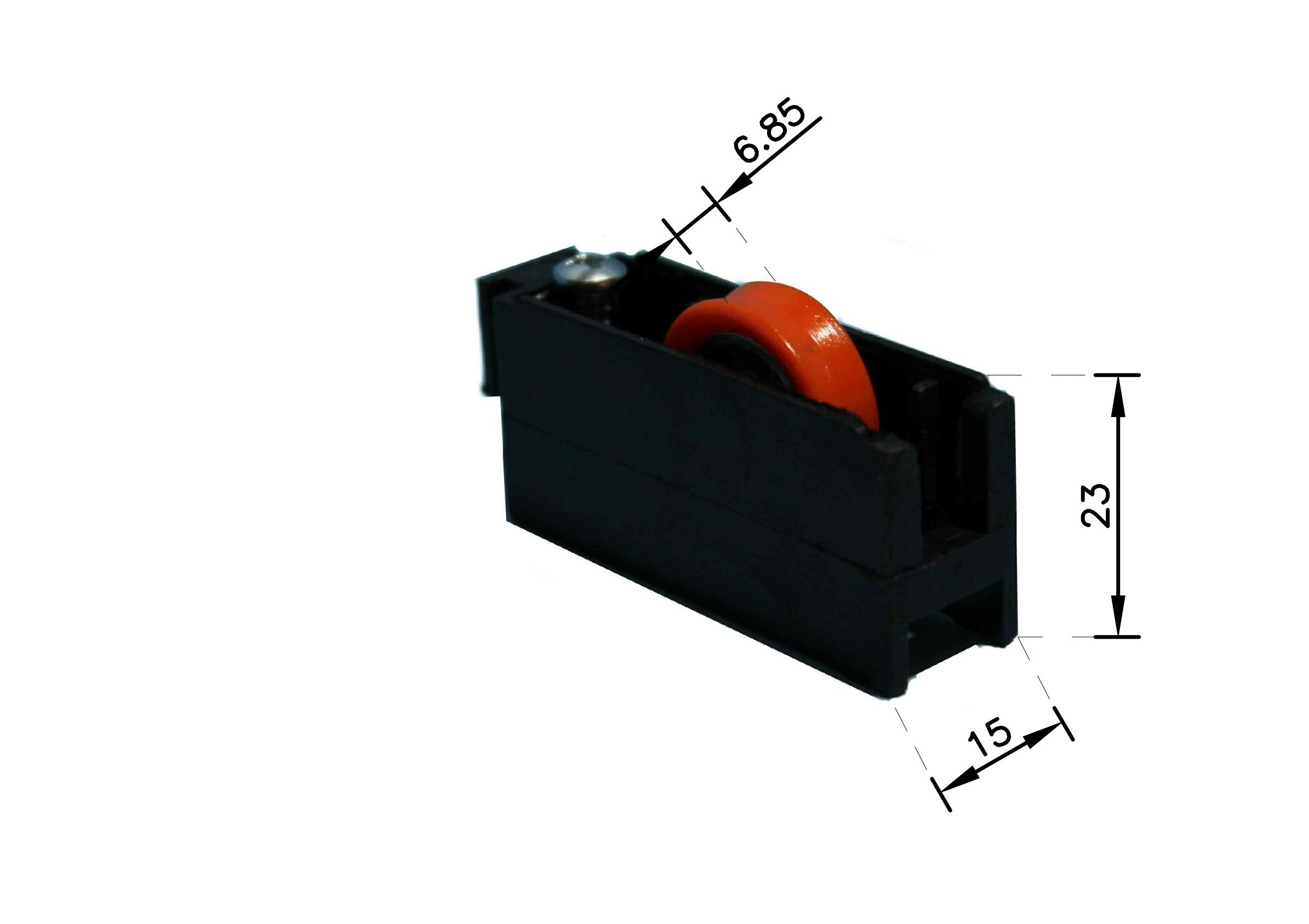 Rodamiento de bolas para puertas y ventanas correderas, montado en carcasa de nylon negro para perfiles de aluminio serie TRIANA. Medidas: 20mm diámetro, 7mm ancho. Altura ajustable en tres posiciones. Tornillo de fijación para evitar desplazamiento. Pestaña permite acople en tandem para distribuir carga.