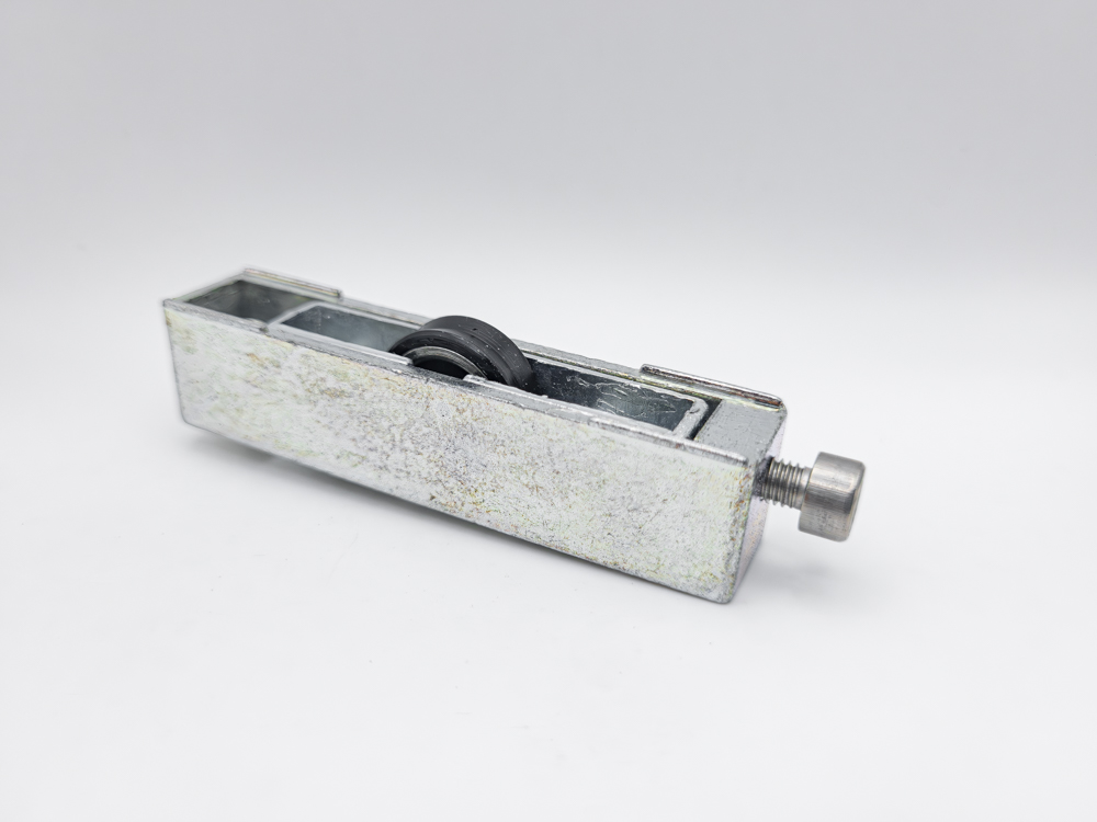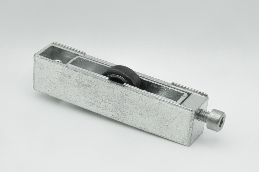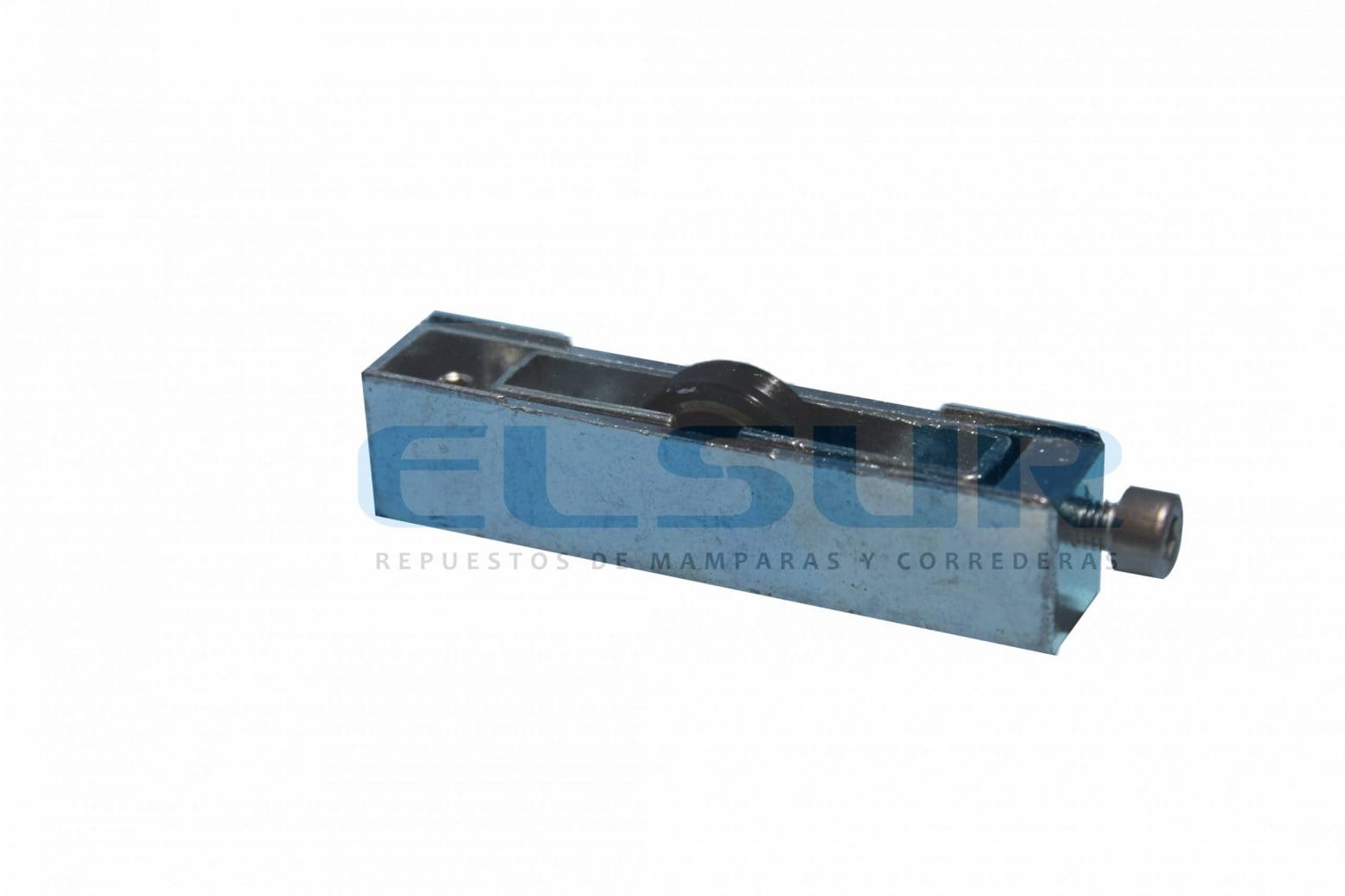 Rodamiento de bolas de altura regulable montado en carcasa de zamak para perfiles de aluminio serie TRIANA. Rueda de 20mm de diámetro y 6mm de ancho. Ajustable con llave Allen. Incluye espárrago de fijación para evitar desplazamiento en el perfil.